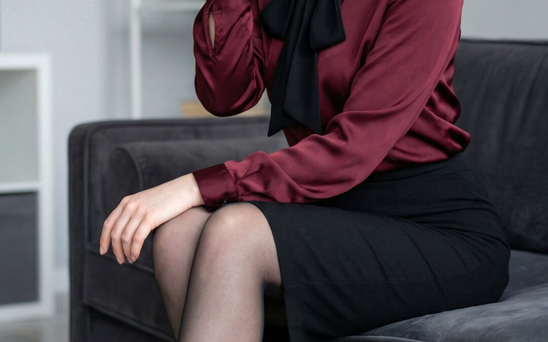 La blouse bordeaux satinée attire immédiatement le regard. Sa richesse, sa profondeur, apporte une chaleur presque enveloppante. Le noir du nœud ajoute quant à lui une touche d’autorité douce… une élégance classique qui évoque à la fois le sérieux et le raffinement.