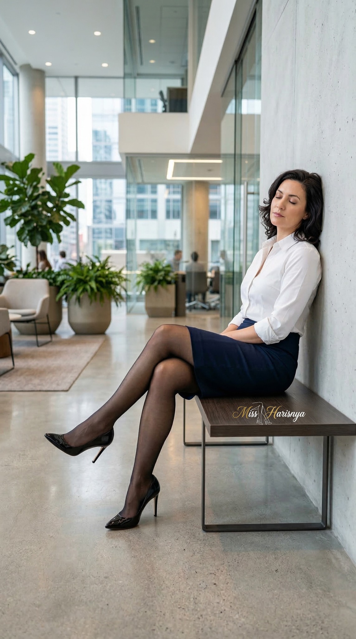 Dans ce décor lumineux, presque minimaliste, elle s’accorde un moment de pause. Adossée contre le mur, les yeux fermés, comme suspendue entre deux réunions, entre deux décisions, entre deux moments de vie. Une respiration élégante dans une journée bien remplie.